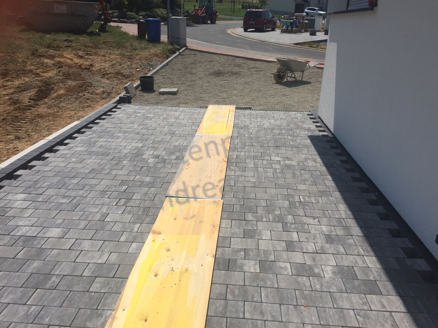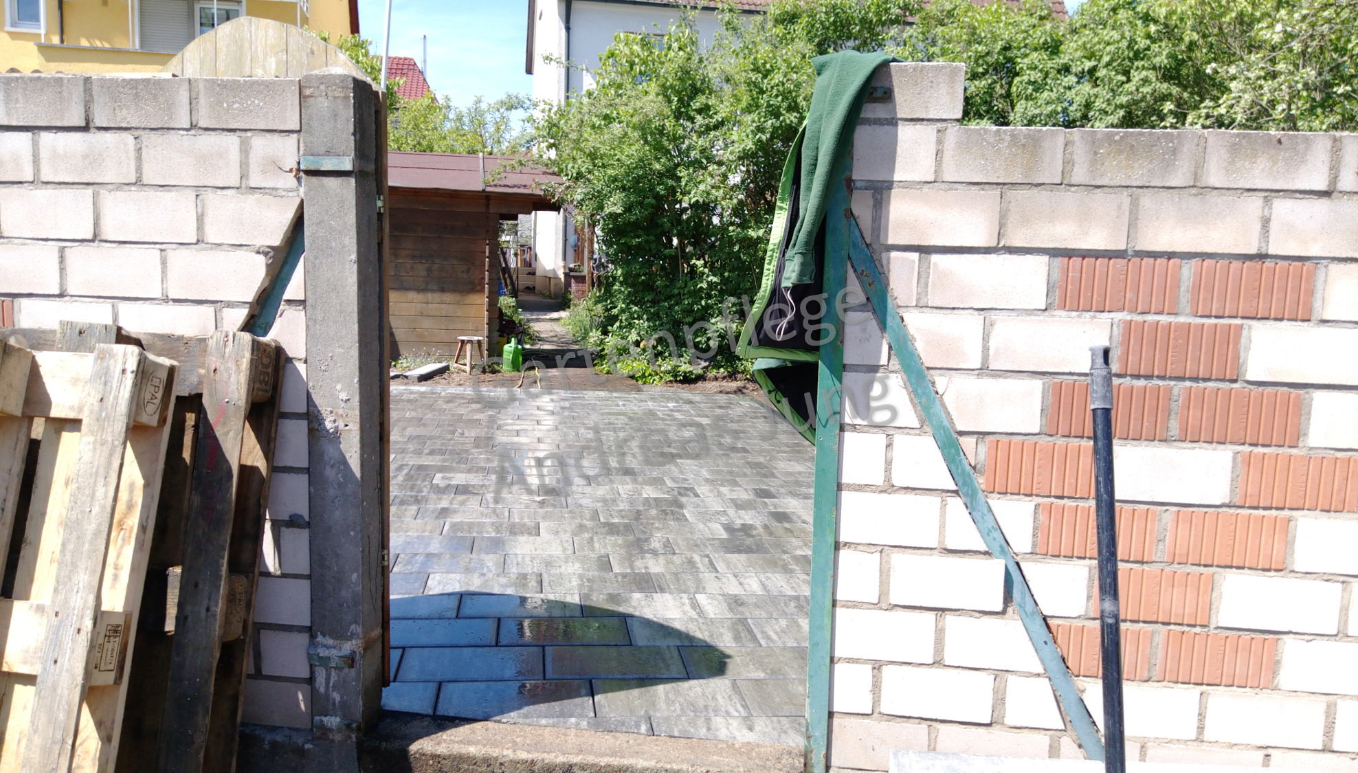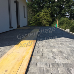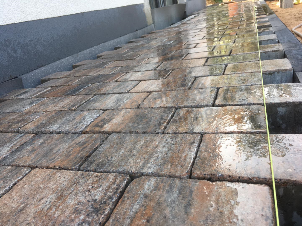 - Neues Pflaster in Muschelkalkoptik im Rastermaß verlegt.