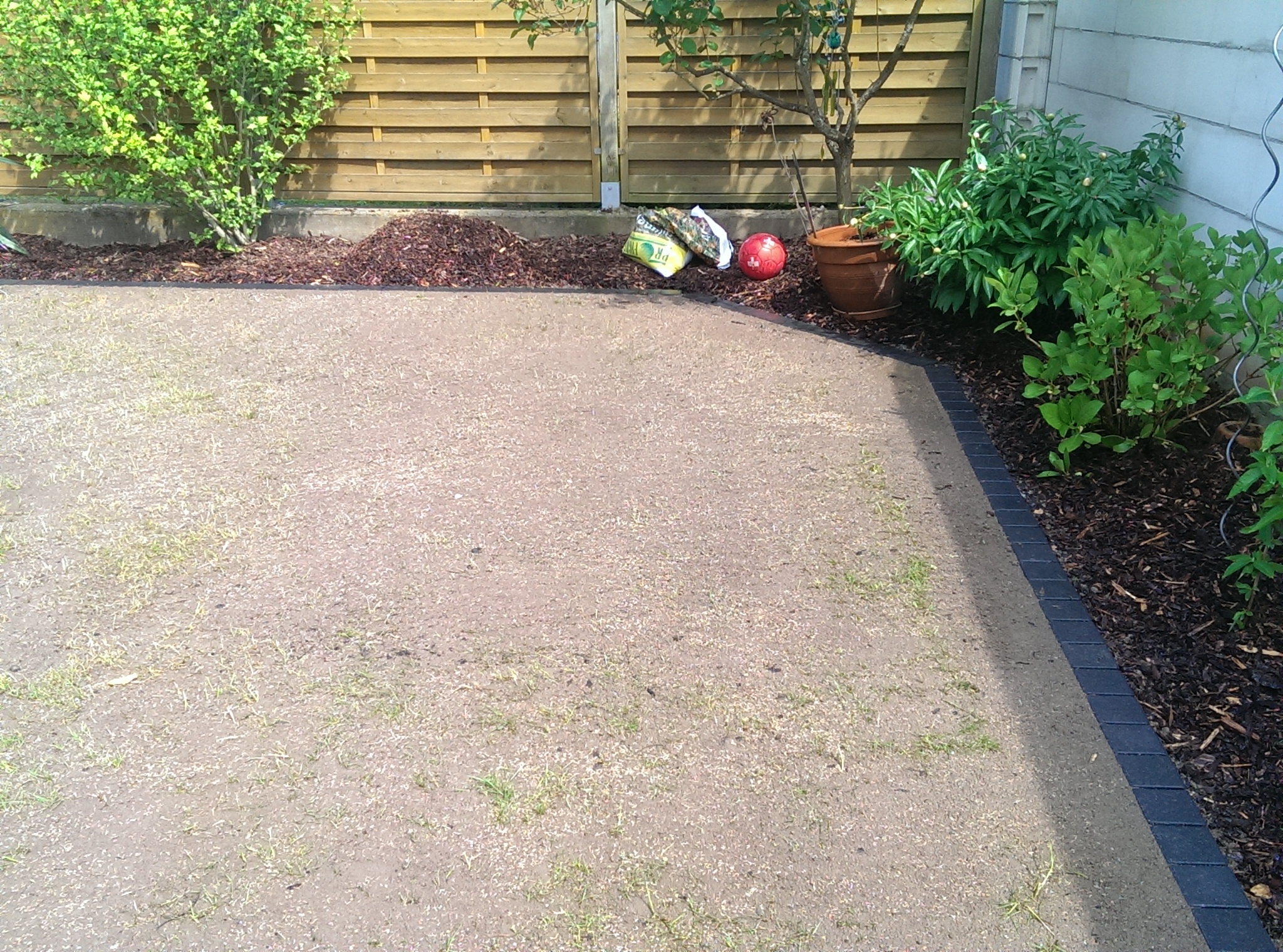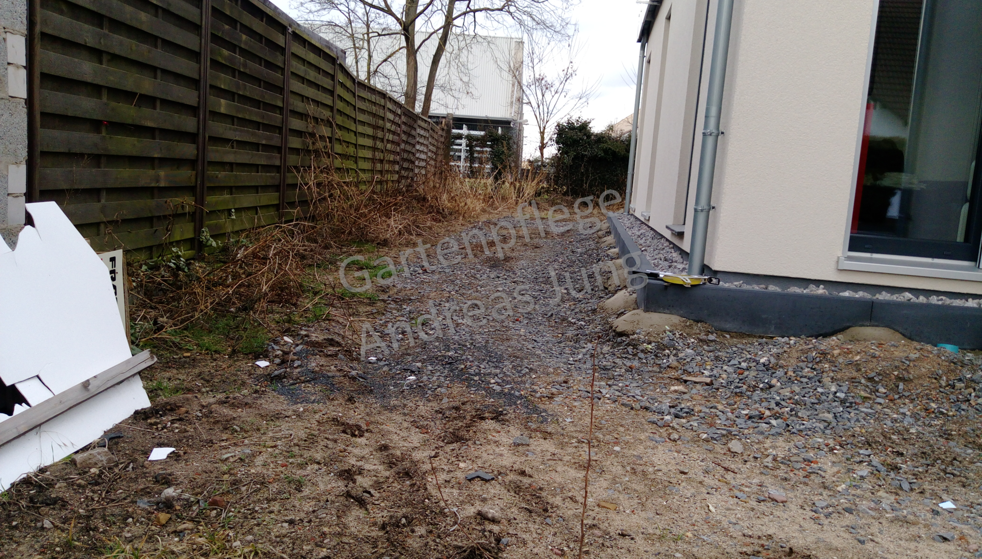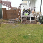 Hier baue ich mit dem Kunden nun seine Hauptterrasse, die oberhalb des Gartens liegt und über eine schmale Treppe, die sich von unten weitet und an einem zurück gesetzten Gartenhausstellplatz vorbei führt, begehbar ist.