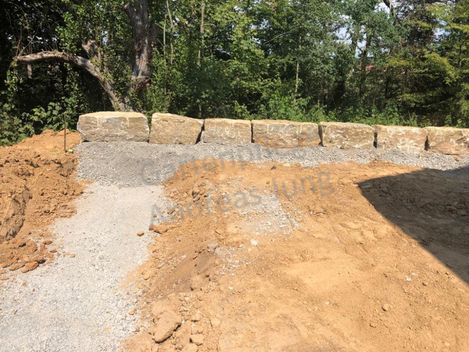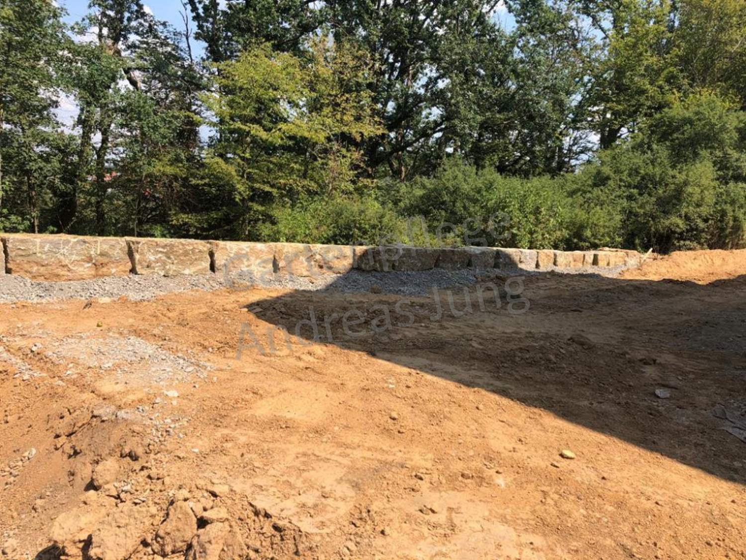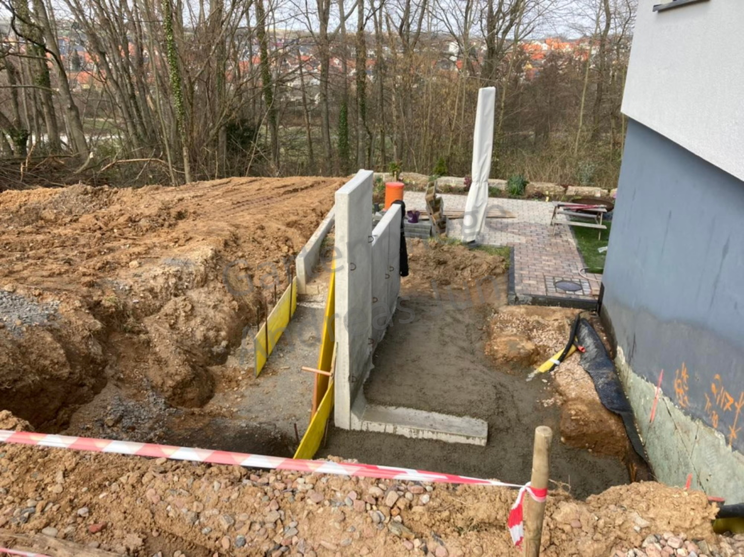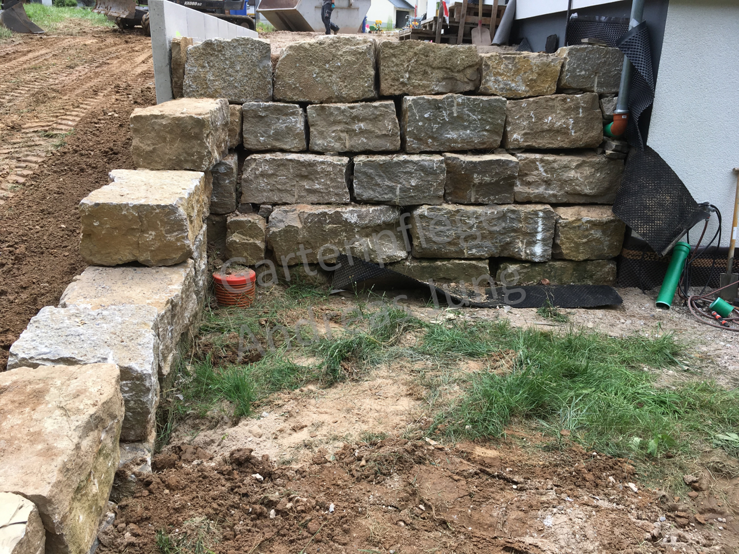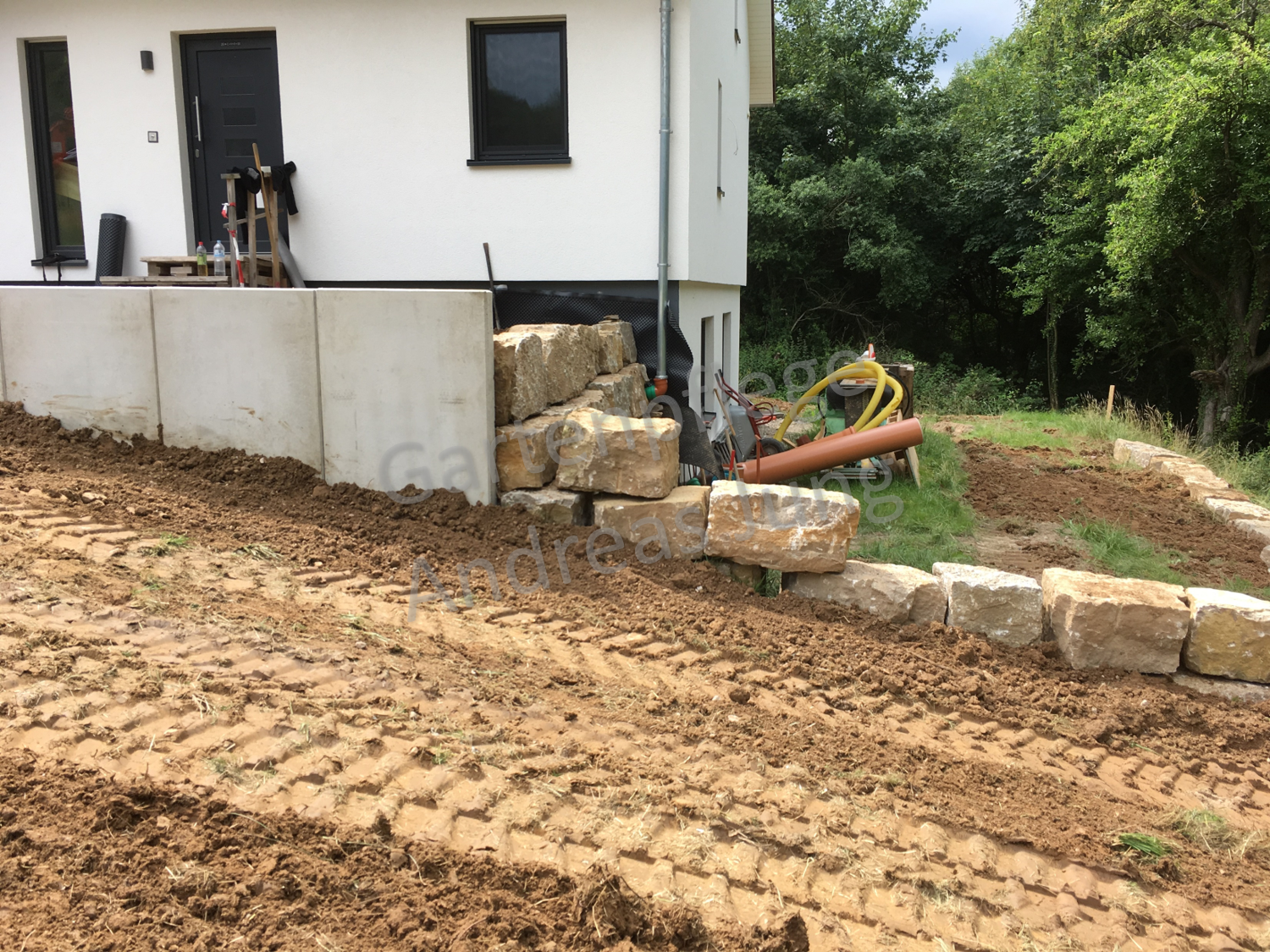Der Hang wurde parallel zum Haus mit bis zu 2 Meter hohen Mauerscheiben abgefangen und die vom Tiefbauer provisorisch gebaute Muschelkalkquaderwand zwischen den Mauerscheiben und der Kellerwand neu aufgebaut.