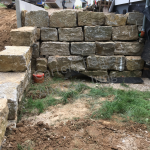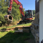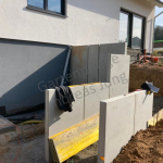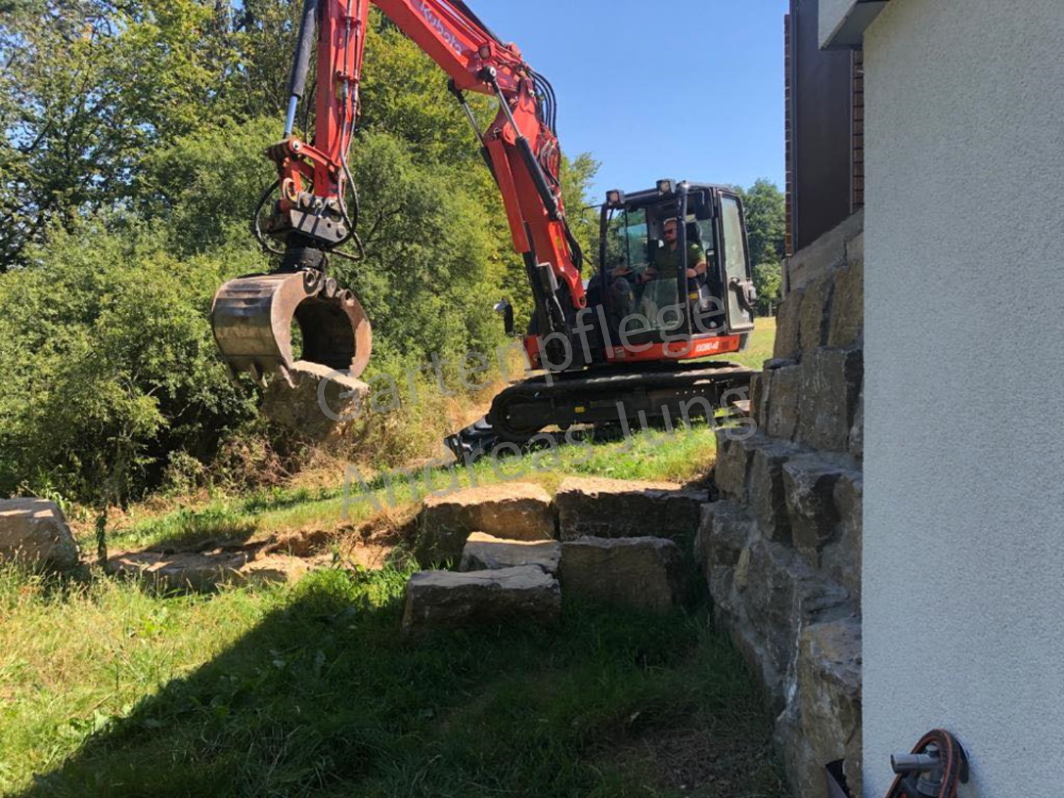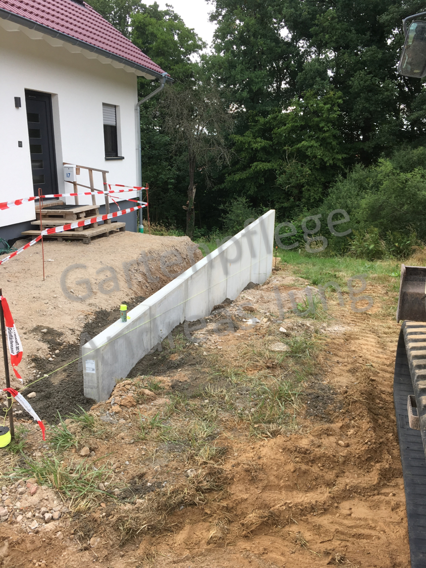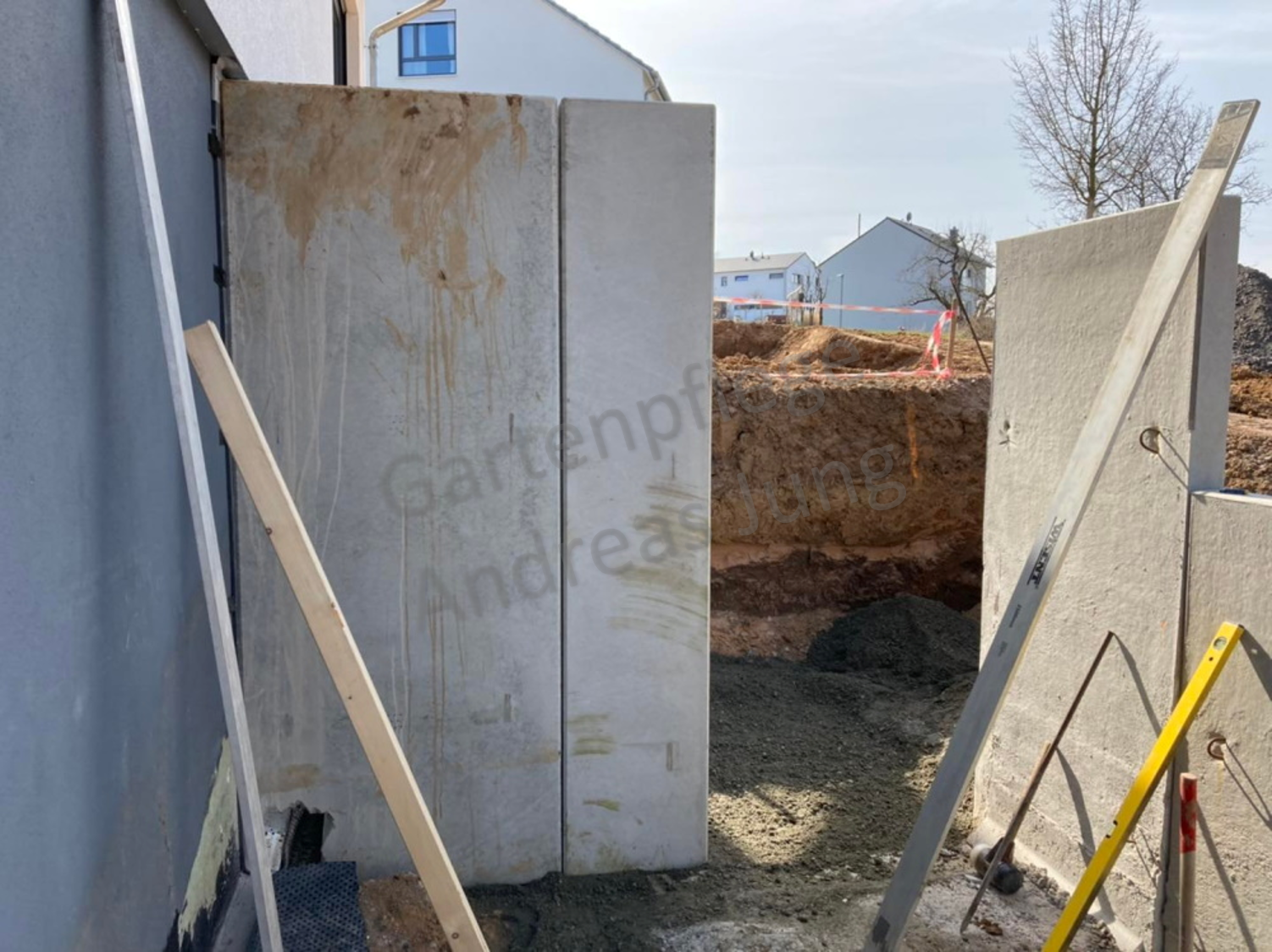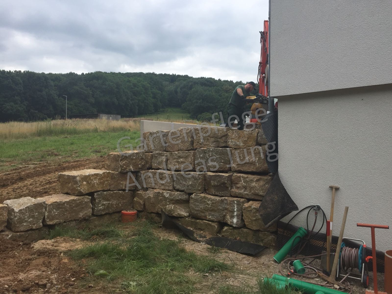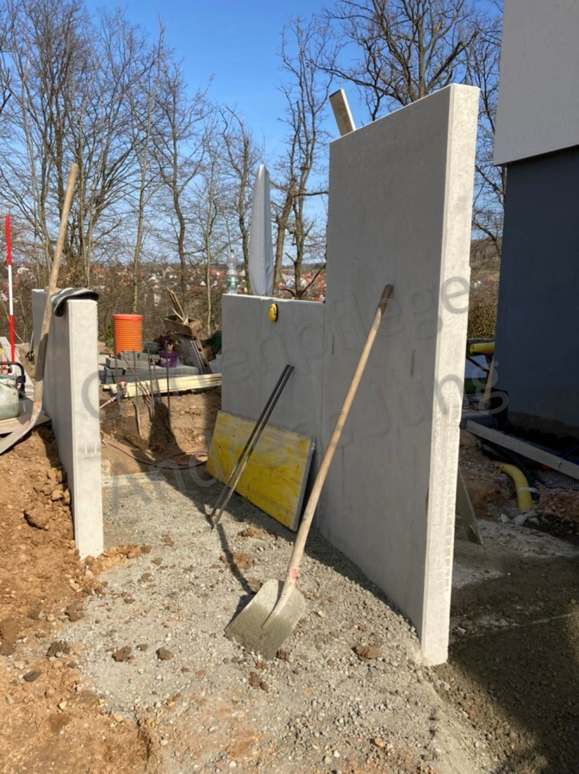 Der Hang wurde parallel zum Haus mit bis zu 2 Meter hohen Mauerscheiben abgefangen und die vom Tiefbauer provisorisch gebaute Muschelkalkquaderwand zwischen den Mauerscheiben und der Kellerwand neu aufgebaut.