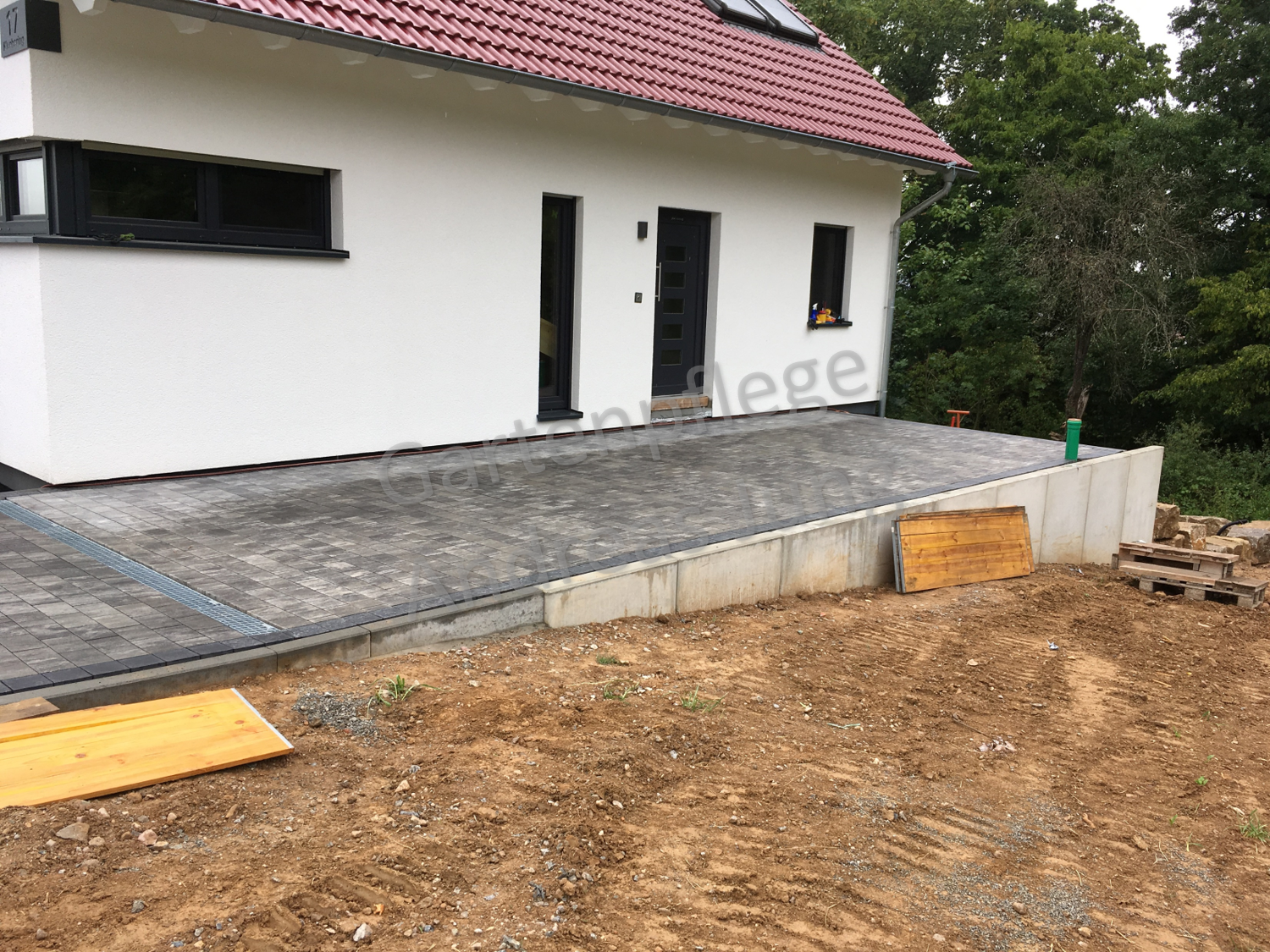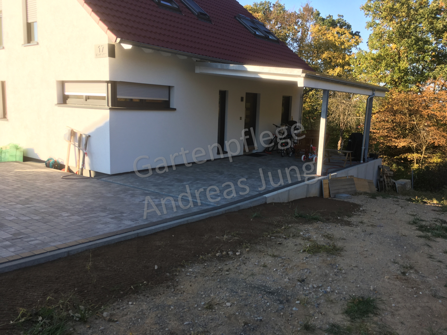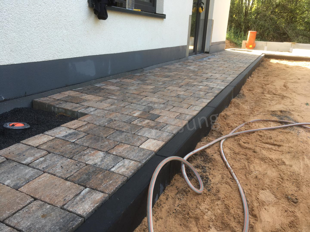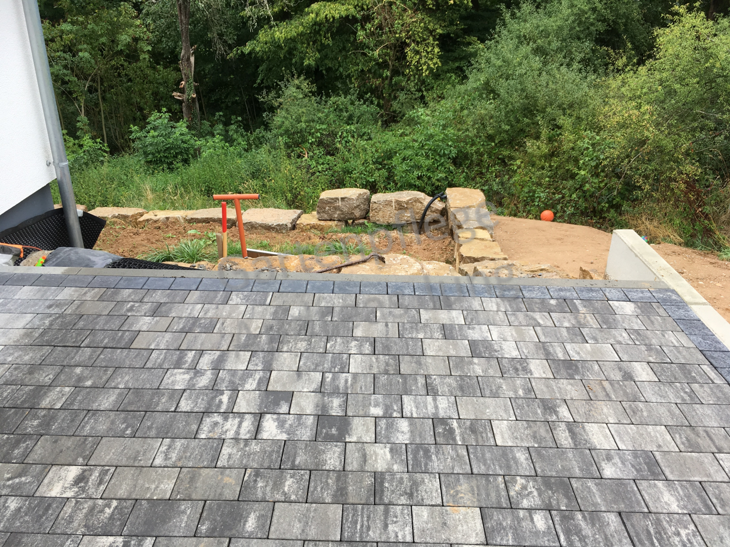 - Weg und Freisitz gepflastert mit Betonpflaster in Muschelkalkoptik
