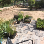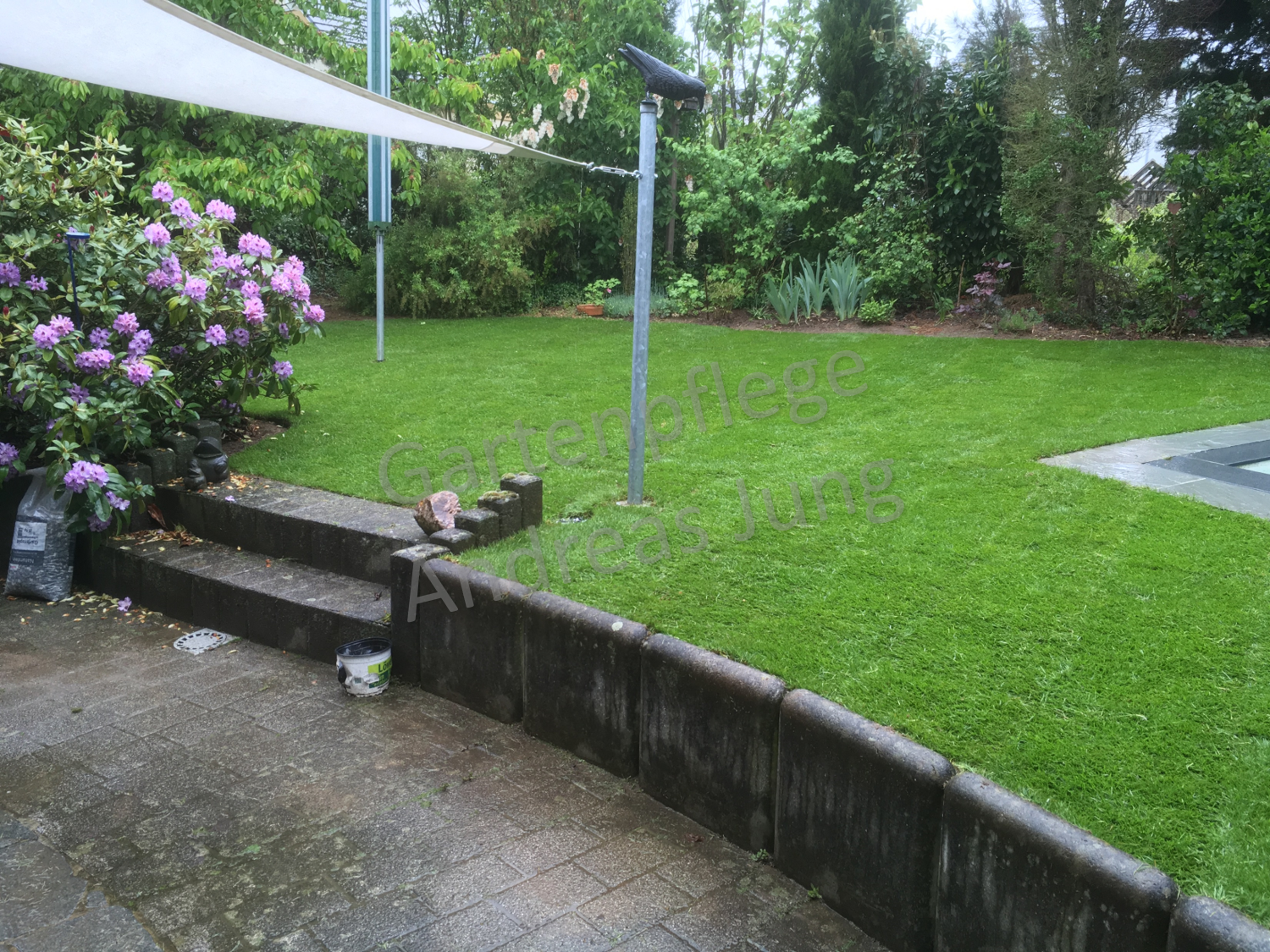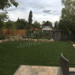 Die Kunden werden in Eigenleistung noch eine kleinen Trockenmauer im Bereich der Treppe aufsetzen und den Höhenunterschied zur befestigen Fläche mit Oberboden auffüllen.