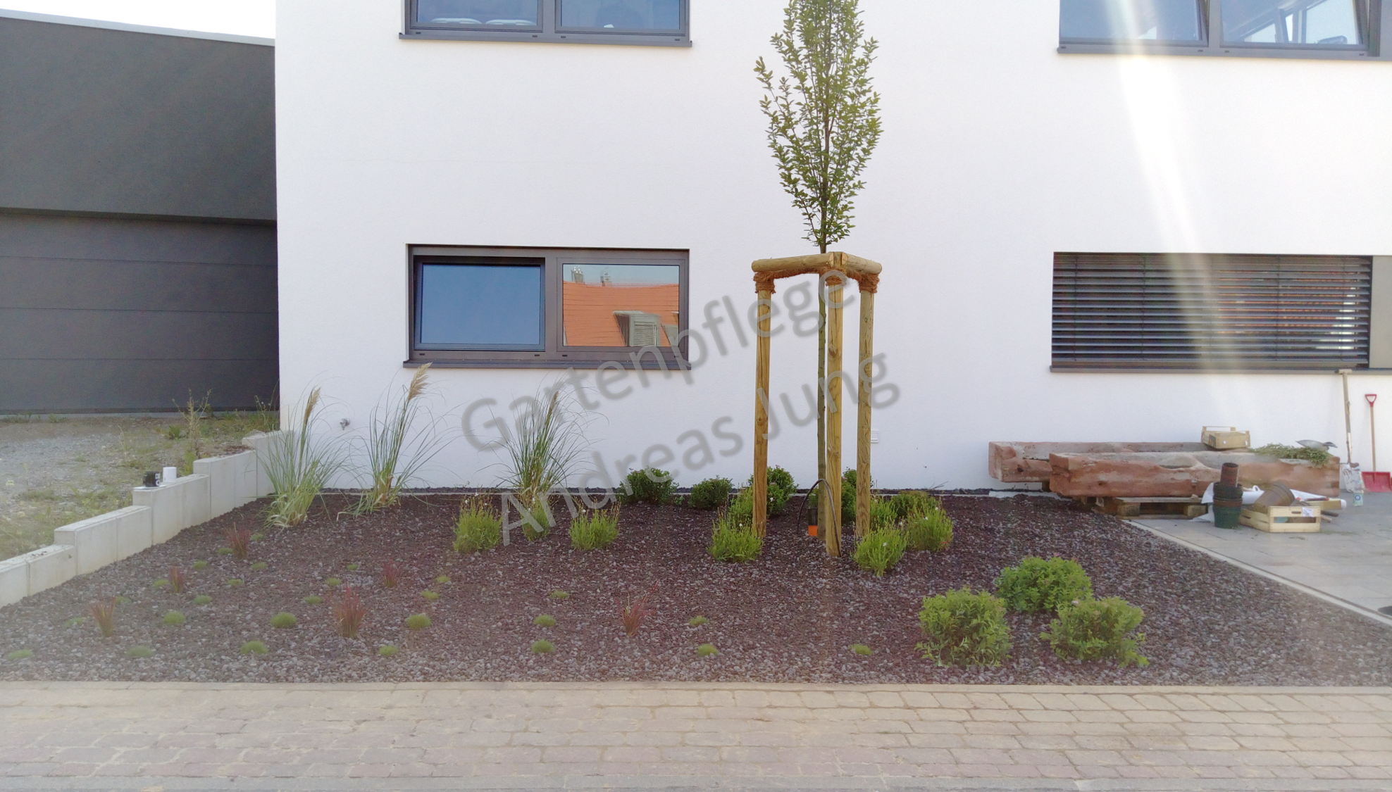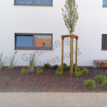 - Baumpflanzung im Vorgarten inkl. Baumanbindung und Bewässerung