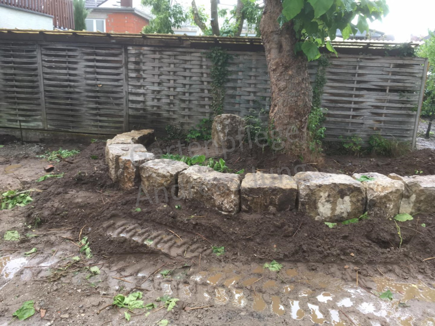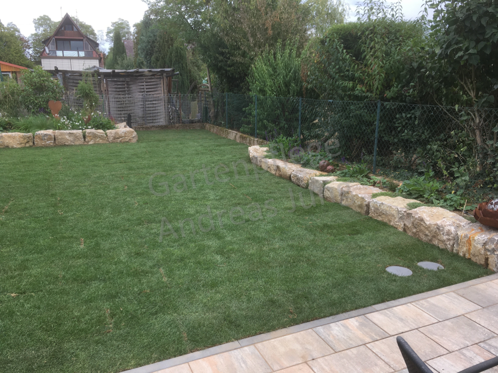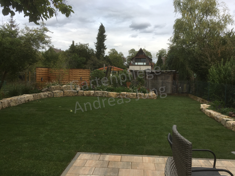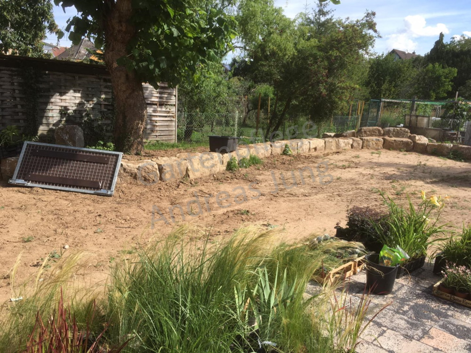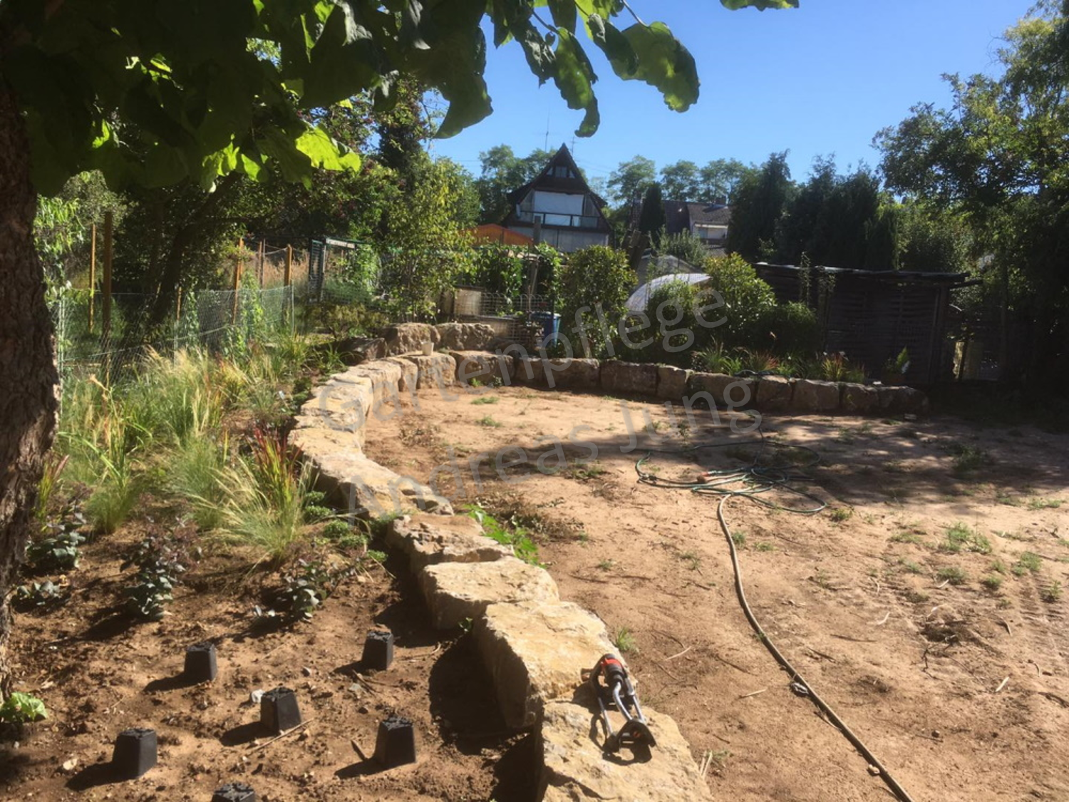 Hier wurde die Grundstücksgrenze mit Muschelkalkquadern abgestellt, eine kleine Terrasse, Wege, Beete und Rollrasen sowie eine Feuerstelle gebaut. - Abschnitt 3 umfasst nun die zweite Hangseite.