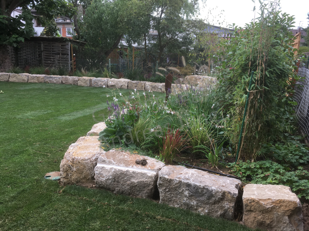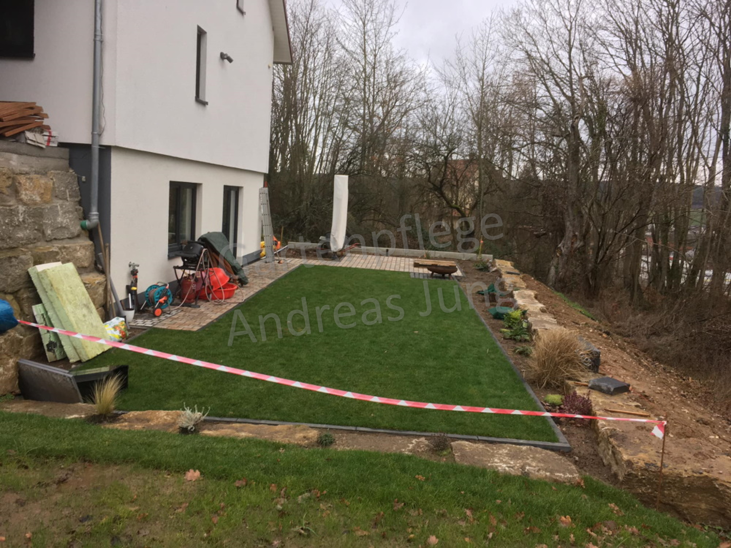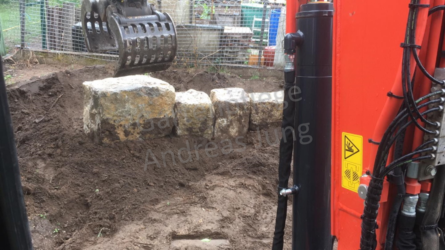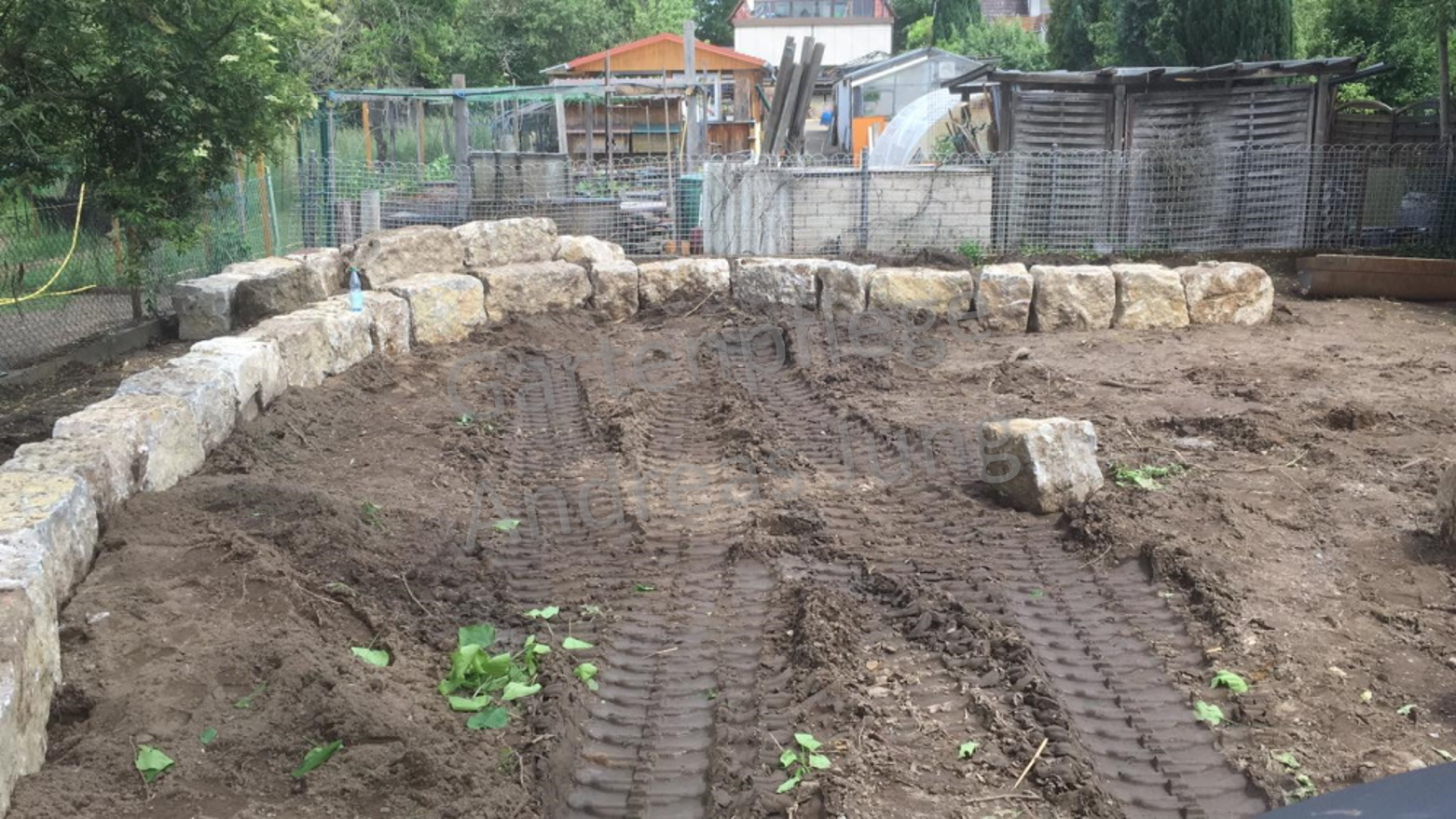 Hier wurde die Grundstücksgrenze mit Muschelkalkquadern abgestellt, eine kleine Terrasse, Wege, Beete und Rollrasen sowie eine Feuerstelle gebaut. - Abschnitt 3 umfasst nun die zweite Hangseite.