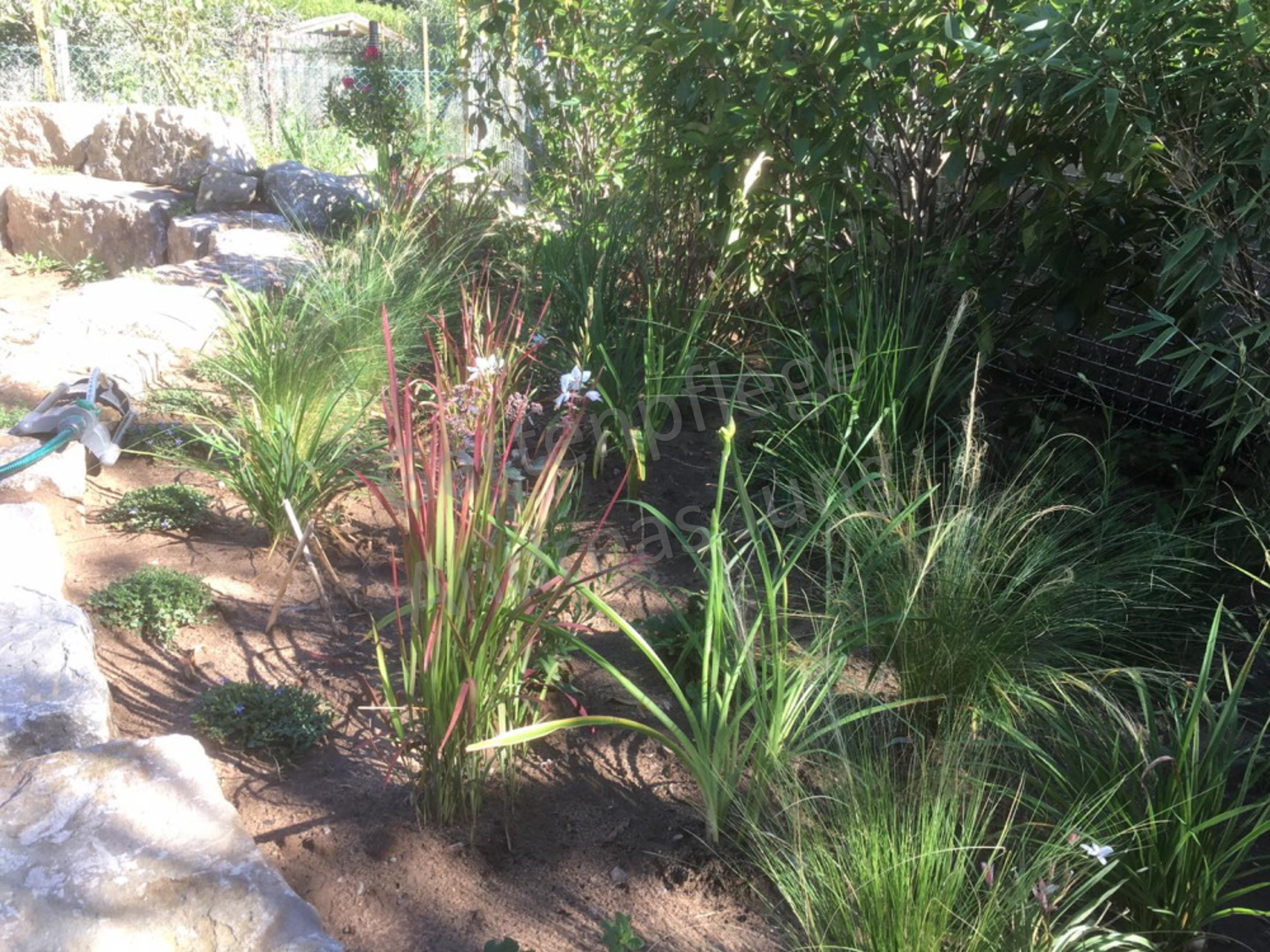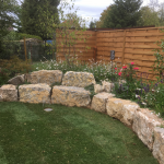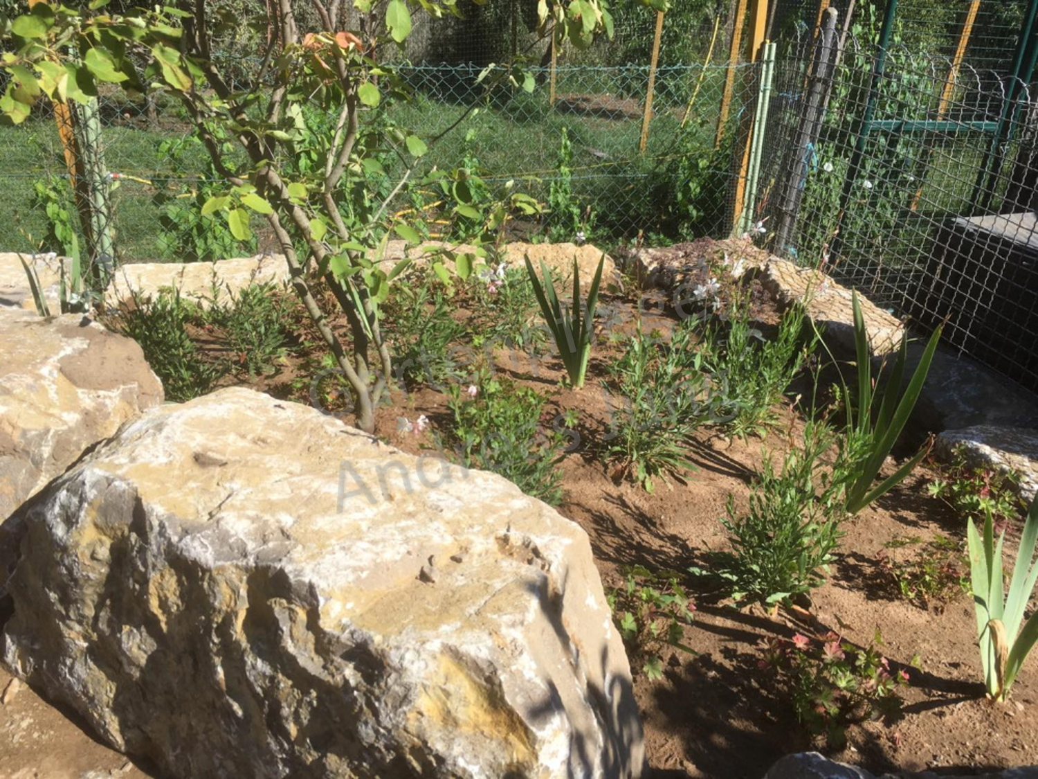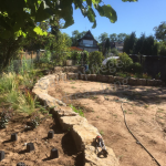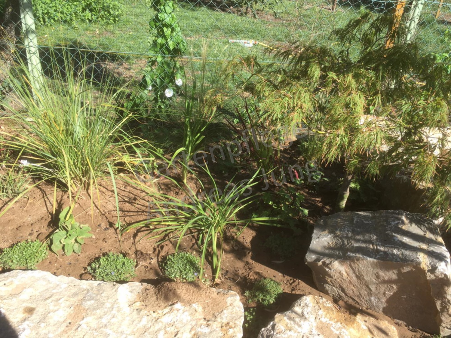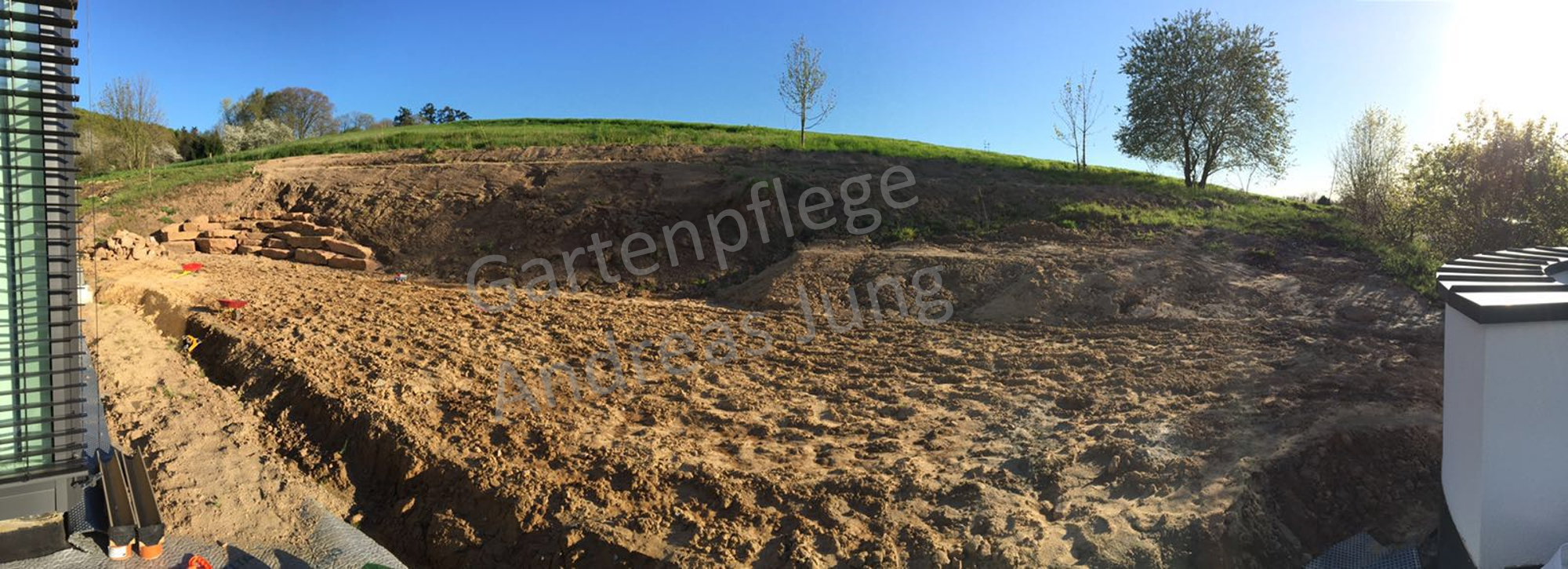 Hier wurde die Grundstücksgrenze mit Muschelkalkquadern abgestellt, eine kleine Terrasse, Wege, Beete und Rollrasen sowie eine Feuerstelle gebaut. - Abschnitt 3 umfasst nun die zweite Hangseite.