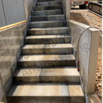 - zweistufiges Treppenpodest mit Palisadeneinfassung und Drainagerinne im Türbereich
